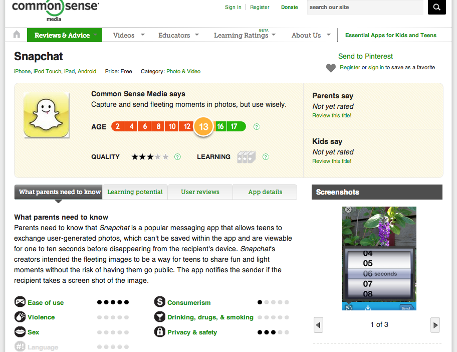 Common Sense Media has some great resources for parents to help them set appropriate ground rules for their kids. It also provides parents with great app reviews, like the one below for Snapchat. You can search with the box in the upper right hand corner for a review of most apps and find out some useful information before deciding whether or not it is appropriate for your child.