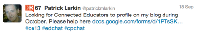 The United State Department of Education has declared the month of October Connected Educator Month. According to ConnectedEducators.org,  the website set up to support this event, the Mission of Connected Educator Month is to  promote educators learning and collaborating through online communities of practice and social networks.With this in mind I reached out to my Personal Learning Network (PLN) via Twitter, my favorite resource for connecting, and tweeted the following: