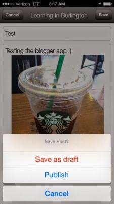When you click on save in the upper right corner it gives you the option of saving as a draft or publishing right from your mobile device. Saving as a draft will allow you to check out your post on a computer before publishing.
