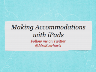 Francis Wyman fifth grade teacher Kim Lynch shared a great site she learned about at the iPad Summit in Boston last week. The site, which was created by Liberty-Perry Schools District Technology Coach/Special Education Coordinator Amy Everhart, has a wealth of resources for making accommodations for students with special needs with the iPad.
