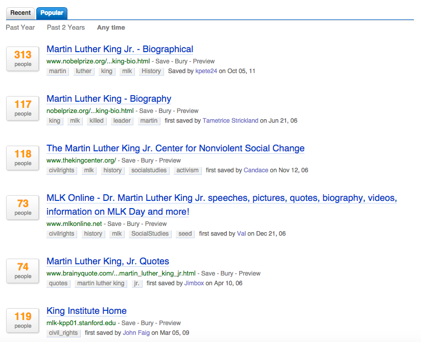 The search below is from Diigo where members can click on the Discover tab at the top of the page and then choose Community to search the bookmarks of everyone who uses the service. The list below gives an example from the Martin Luther King Jr. search that was also done on Google. The top sites about Martin Luther King Jr. here are from the Nobel Prize, Stanford University and the King Center which was founded by Coretta Scott King.