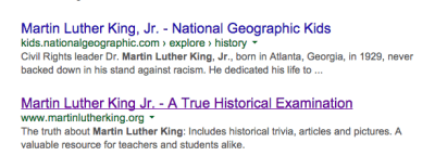 I wrote a bit about the problems inherent in a random Google search a while back and thought I’d revisit this example with Diigo to show the advantage. When you do a random Google search for information on something (i.e. Martin Luther King Jr.) you don’t really now the quality of the site before digging beneath the surface of the link. The example below highlights this fact as the links below that came up on the first page of my Google search include martinlutherking.org which is run by the White Supremacist group Storm Front.