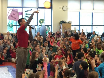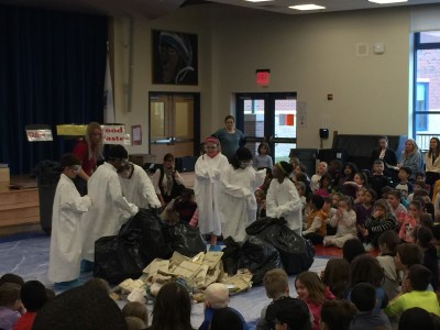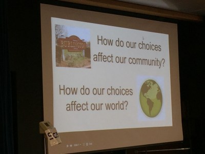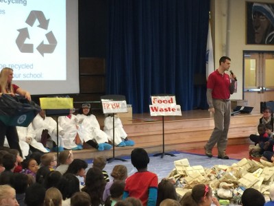 This morning Mr. Musselman and Ms. Pavlicek from the Burlington Science Center made their way to Memorial School to meet with the entire student body about their habits discarding their trash during lunch.  Mr. Musselman and Ms. Pavlicek had confiscated the trash bags from the lunch room yesterday and today they returned to dump out the contents and do a little digging to see if the students had some solutions that would lead to less waste.