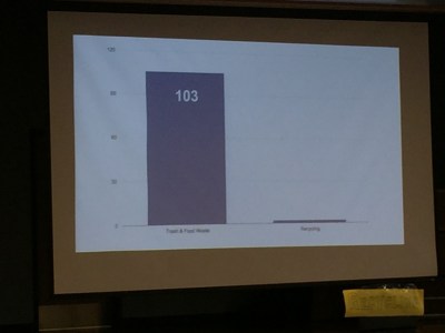 Mr. Musselman and Ms. Pavlicek let the students know that the weight of all of the trash on Monday was 103 pounds (shown in the slide below) and that the goal for the remainder of the week would be to lower the number of trash each day.  They discussed the items that should be placed in each of the non-trash categories to help lower the total weight. In addition, permanent recycling bins have been ordered to help encourage students to think twice about what they put in the trash. Additionally, students were asked to consider ways to lessen the amount of food that is thrown away.