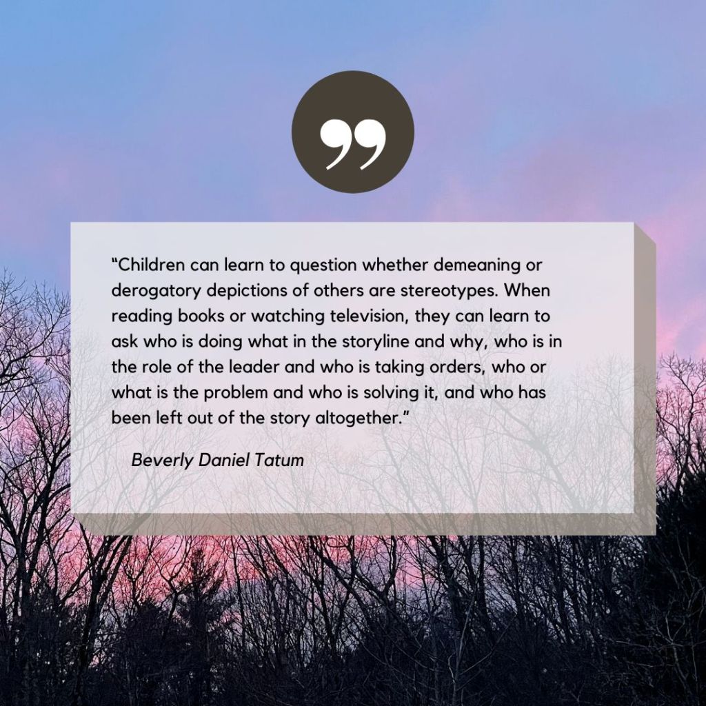 “Children can learn to question whether demeaning or derogatory depictions of others are stereotypes. When reading books or watching television, they can learn to ask who is doing what in the storyline and why, who is in the role of the leader and who is taking orders, who or what is the problem and who is solving it, and who has been left out of the story altogether.”